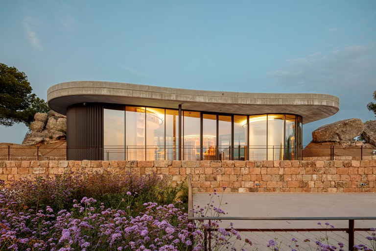 "Queríamos diseñar un edificio que fuera una referencia arquitectónica audaz que no alterara los valores milenarios del paisaje de Les Garrigues, cuyo arte de construcción en piedra seca es patrimonio cultural de la UNESCO", afirma el arquitecto Marc Alventosa, del estudio barcelonés Alventosa Morell Arquitectes, autor de este proyecto icónico. Para ello, el edificio, de 17 metros de altura, está enterrado en el suelo para mimetizarse con el paisaje, siguiendo el modelo de las terrazas agrícolas de los olivares. Desde el exterior, el molino imita la naturaleza: muros de piedra, tejados plantados con plantas y árboles autóctonos. En el interior, la roca se convierte en un elemento decorativo. Único volumen visible, servido por un diseño arquitectónico orgánico, el área de recepción emerge en lo alto de la colina como un hito. Su tejado de hormigón sigue las suaves líneas impuestas por el entorno natural y su fachada acristalada ofrece una excepcional vista panorámica de la finca y de las cordilleras del Montsant y los Pirineos.